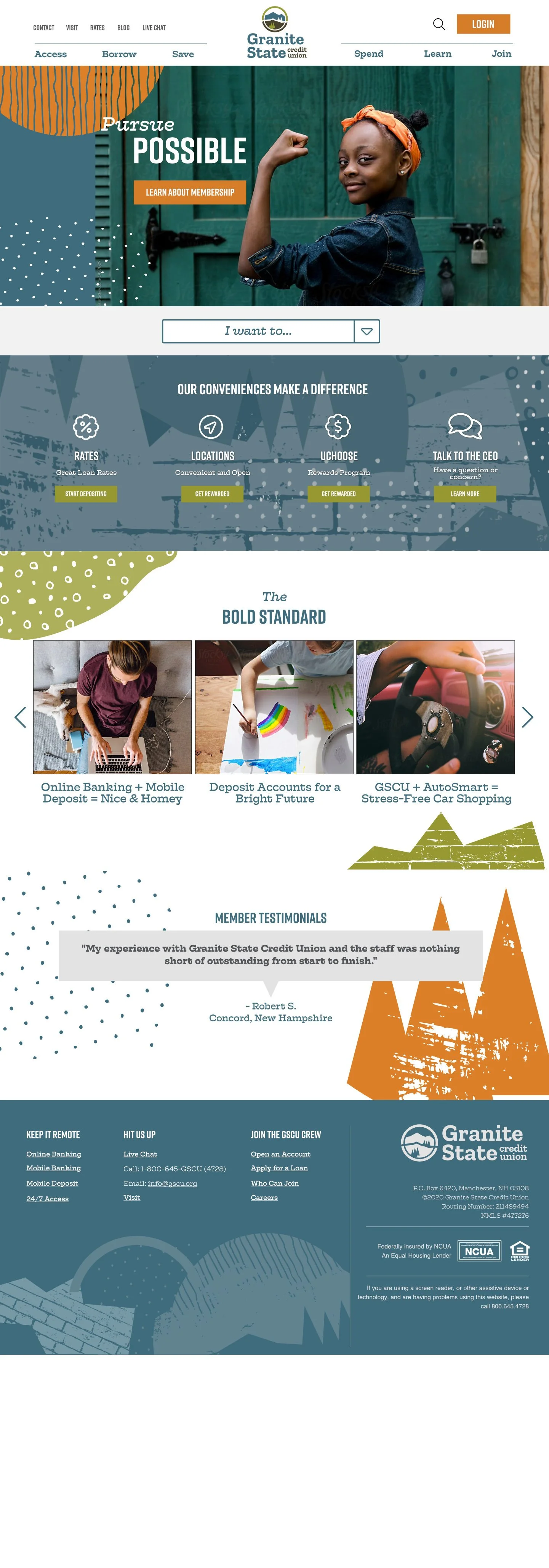 Prior to this redesign, Granite State Credit Union had a recently launched website built with its previous branding. While the platform was technically sound, the design lagged behind a newly introduced brand system that emphasized expressive visual elements, including updated colors, background patterns, and imagery.